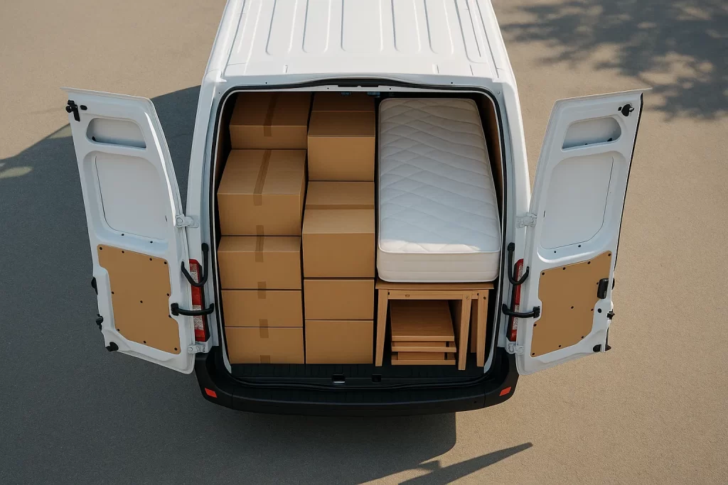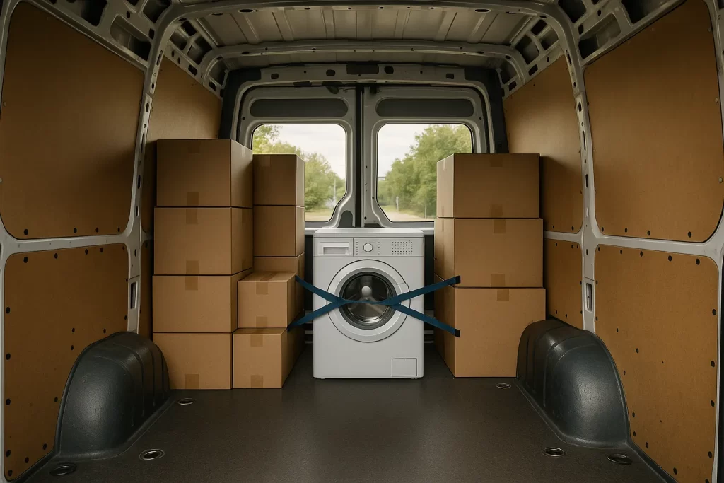 2. „Tetris“ nakládka – Těžké spotřebiče k přepážce, lehké krabice nad ně. Dodávky do 3,5 t mají reálnou nosnost 1 200–1 500 kg; kontrolujte váhu, ne jen objem.
